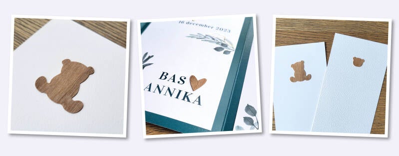 Onlangs heb ik een voorstel gedaan voor een geboortekaartje, en hiervoor maakte ik een silhouet van 2 verschillende beertjes van echt hout. En dan niet die dikke, lompe figuren waar je envelop van kapot scheurt, maar hele dunne, super strak uitgesneden figuurtjes. Ik heb dit hout al eens eerder gebruikt voor een trouwkaart, toen maakte ik een hartje. Maar er is nog zoveel meer mogelijk! Mocht jij dus opzoek zijn naar een uniek geboortekaartje met een houten figuur erop (en dat kan van alles zijn!), en je vind de gangbare houten elementen ook niet zo mooi: ik help je ontzettend graag! De figuren snijd ik uit dun fineer op mijn eigen plotter, dus het is echt op maat gemaakt. Doordat ik dit niet uitbesteed, heb ik dit zelf in de hand en kan ik het dus volledig naar wens maken. Ga je voor een figuurtje zoals dit beertje? Of misschien wel de eerste letter van de naam van je baby? Vraag gerust mijn informatie-brochure aan als je interesse hebt.