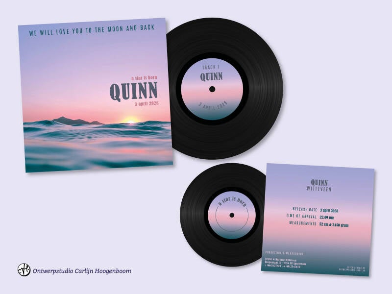Normaal gesproken ontwerp ik alles op maat. Maar omdat er zoveel mogelijk is met deze LP kaartjes, en om toch te kunnen laten zien hoe mooi deze kaartjes zijn, heb ik een kleine collectie gemaakt. Deze ontwerpen zijn al volledig uitgewerkt, en kunnen gepersonaliseerd worden door kleuren en lettertype nog aan te passen naar wens. Het vormgeven van een maatwerk geboortekaartje kost 195 euro. Maar omdat deze ontwerpen eigenlijk al ready-to-print zijn, betaal je voor de ontwerpen op deze pagina geen extra ontwerp-kosten. 1 aanpassingsronde is inclusief, hierin kun je bijvoorbeeld een lettertype of kleurenpalet laten aanpassen naar wens. En uiteraard worden de naam en geboortegegevens van jouw kleintje hierin verwerkt. Zijn er na deze aanpassingsronde toch nog meer aanpassingen nodig? Dan betaal je per ronde een toeslag van 35 euro.