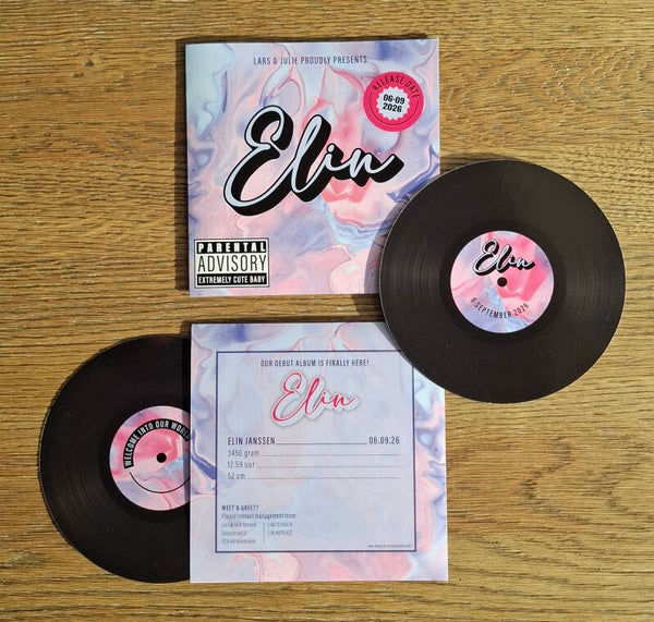 Wil je een feestje versturen na de geboorte van jullie kleintje? Kies dan voor deze tweedelige LP kaart. Eindeloze mogelijkheden om de geboortegegevens op een creatieve manier te verwerken in het ontwerp. Bij dit kaartje van Elin staat de geboortedatum bijvoorbeeld als 'release date' op het kaartje vermeld.