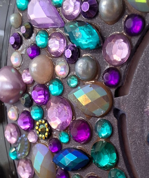 Een echte 7 inch LP single versierd met glimmende steentjes in de 2 kleuren van de hoes: groen/turquoise en paars/lila. Elk steentje is met de hand op het label van de LP geplakt. Elk Discoplaatje is uniek en van elke single is er maar 1.