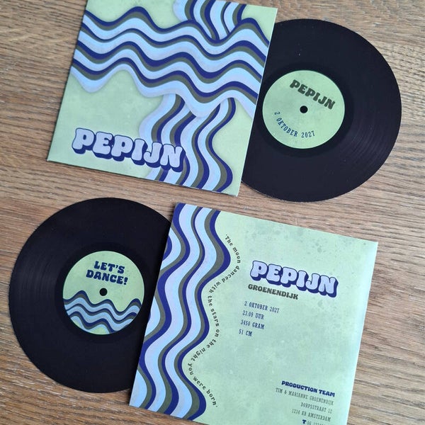 Wil je een feestje versturen na de geboorte van jullie kleintje? Kies dan voor deze tweedelige LP kaart. Eindeloze mogelijkheden om de geboortegegevens op een creatieve manier te verwerken in het ontwerp. De gegevens op deze LP kaartjes zijn fictief, en geven daarmee een goed beeld van hoe ook jouw geboortekaartje eruit kan komen te zien.